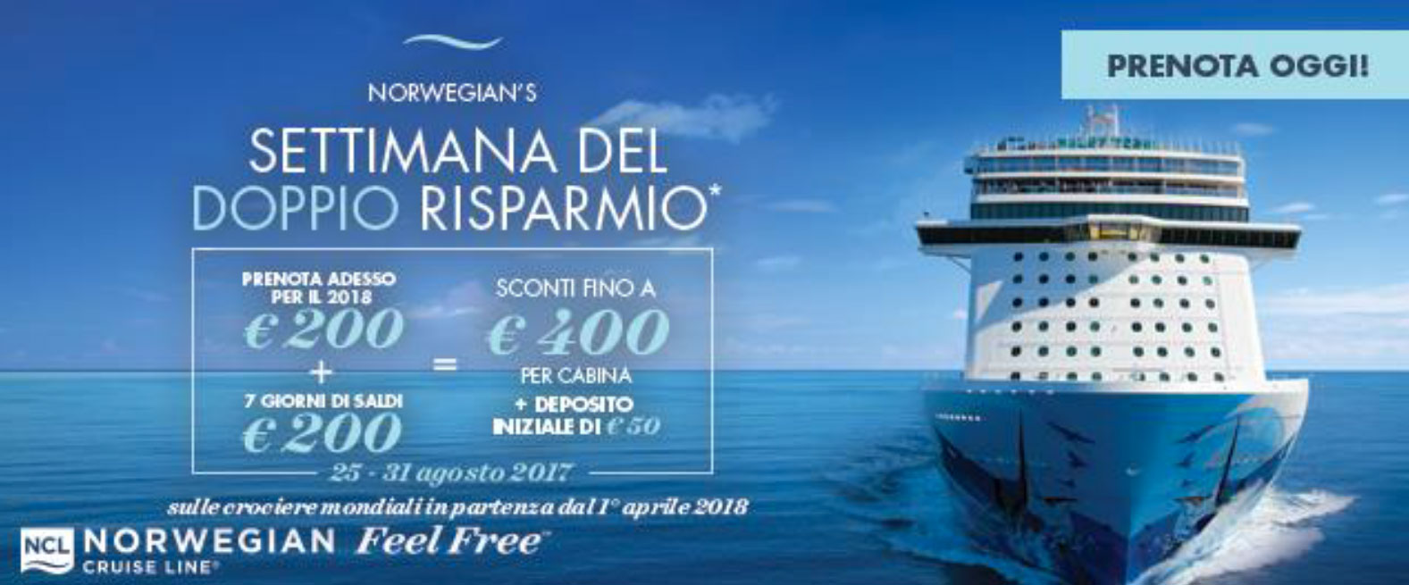 24 agosto 2017 – Gli sconti estivi della promozione Early Booking di Norwegian Cruise Line – valida per crociere di 5 o più giorni prenotate entro il 31 agosto e in partenza dal 1 aprile 2018 – si concluderanno con la settimana del doppio risparmio, attiva dal 25 al 31 agosto 2017. Gli ospiti che prenoteranno in questa settimana godranno infatti di un doppio vantaggio arrivando a risparmiare fino a € 400 per cabina. Inoltre, gli ospiti potranno usufruire gratuitamente di pacchetti extra e della riduzione sul deposito pari a € 50.